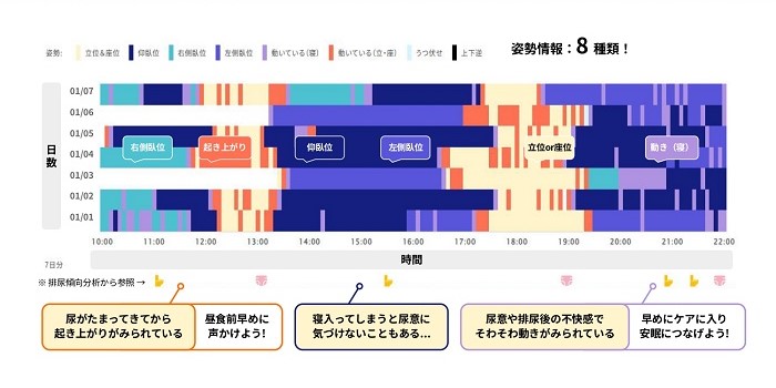 活動傾向を分析することで、排尿傾向を把握してケアに活かすことができます。
