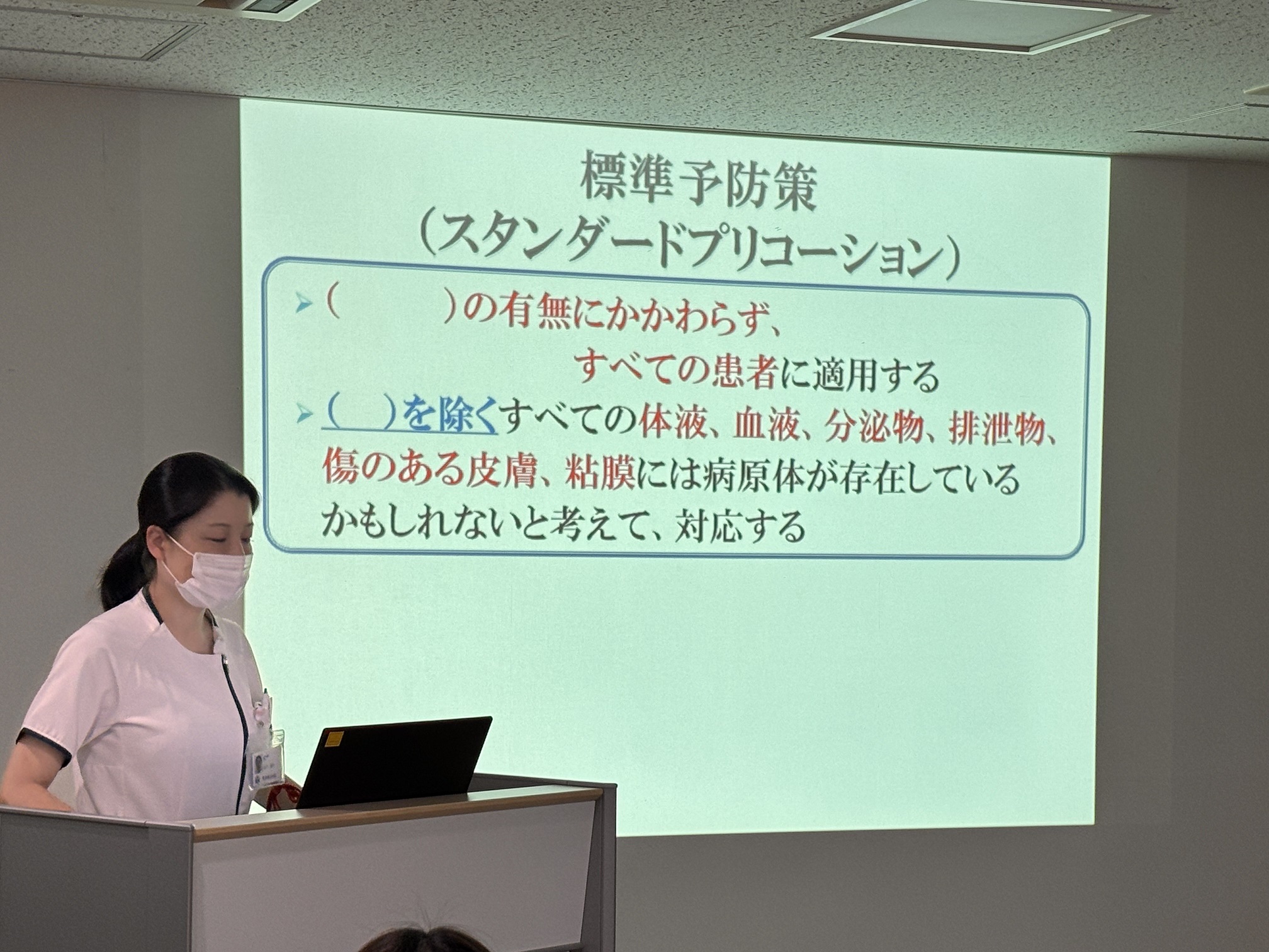 毎年、感染症流行前に職員研修として行います。「感染対策の基礎知識」~嘔吐物処理の実際~隣の聖隷横浜病院から感染管理認定看護師の方を講師にお招きしての研修です。何度も繰り返し確認ししっかり身に着けることが大切です。・高齢者は感染しやすい・感染経路の遮断・持ち込まない、拡げない、持ち出さない・手指衛生は5つのタイミングで実施・清掃は人の手が触れるところ・嘔吐物処理方法を学びました。基本の「手指衛生・手洗い」をしっかりと行い、感染症を予防しましょう。
