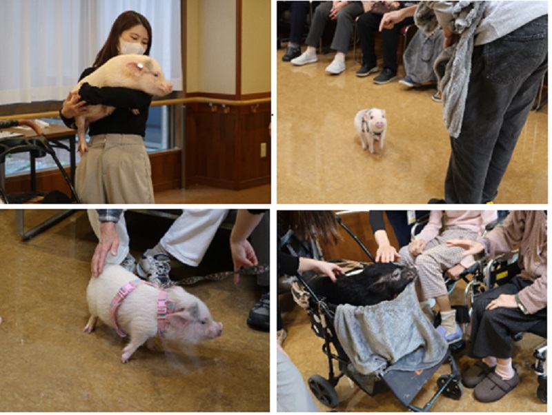 これまでアニマルセラピーでは犬とのふれあいを行ってきましたが、今回は初めての試みとして、かわいらしい3匹のマイクロブタが来てくれました。