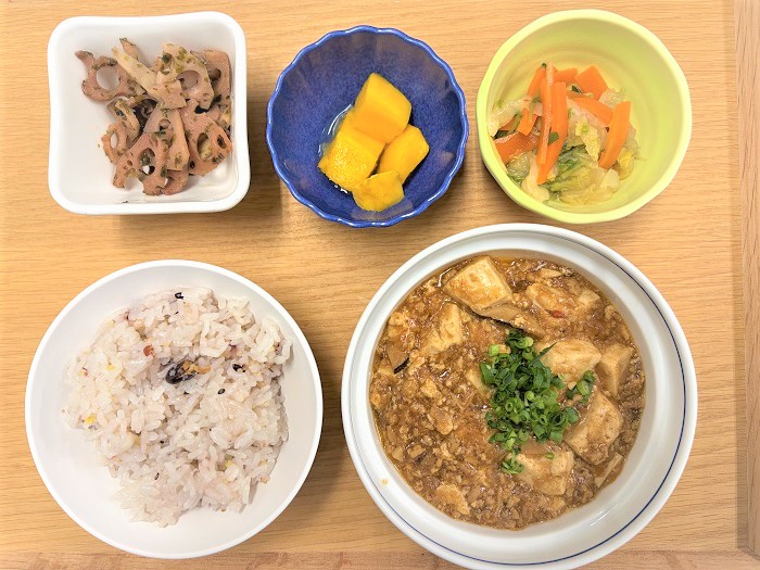 【昼食】麻婆豆腐 エデンの園トップ 松山エデンの園トップ 食事サービス 【昼食】麻婆豆腐 【昼食】麻婆豆腐 2025年12月25日(木) ■メニュー ・米飯 ・麻婆豆腐 ・れんこんの青のり炒め ・白菜のナムル ・フルーツ ■摂取量 ・エネルギー:583kcal ・蛋白質 :21.4g ・脂質 :17.1g ・炭水化物 :88.6g ・塩分 :1.5g ・食物繊維 :5.2g シェア ツイート