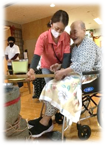 職員による八月踊りに、ご利用者も手を高く上げて、一緒に踊りを楽しみました。