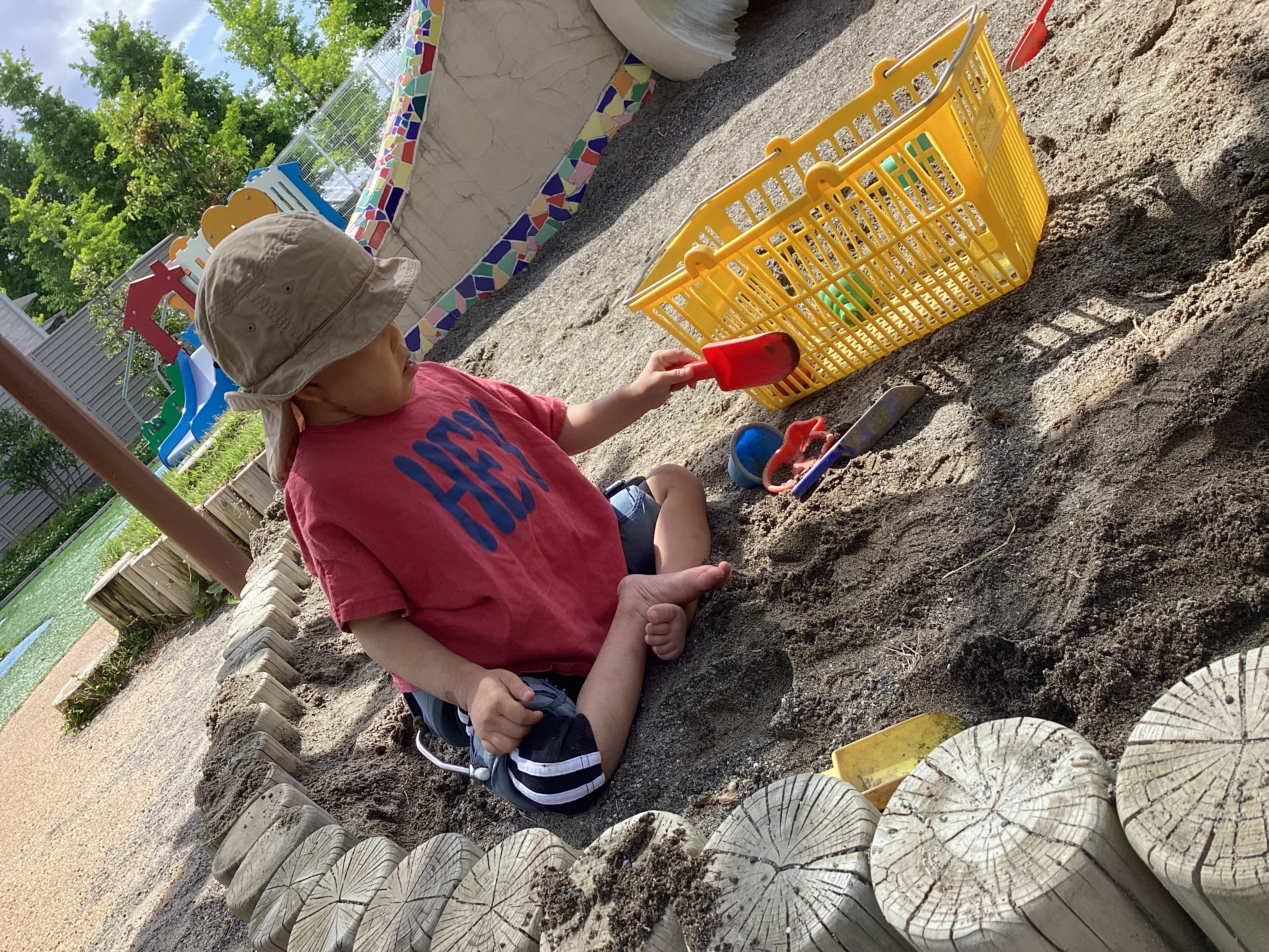 いざ、スプーンを持つ前にもう一段階。指先をたくさん使った感触遊びや、砂場遊びでスコップやバケツなど道具を使って物を扱う遊びを繰り返し行っています。