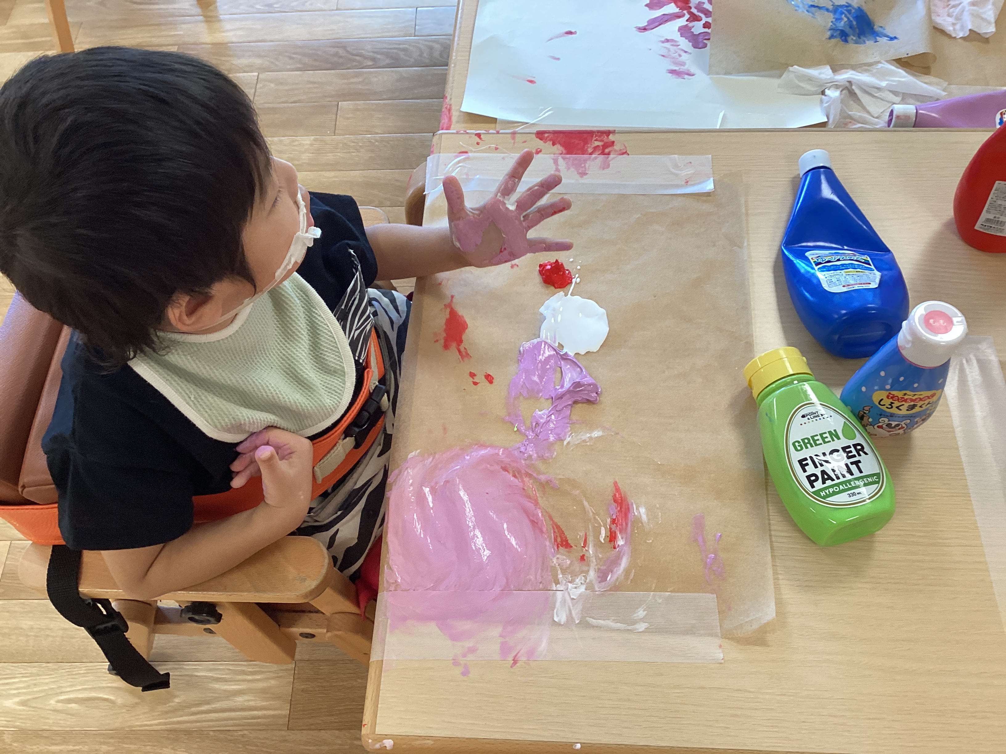 様々な素材を使った感覚遊びの積み重ねは、五感の発達や手先の操作、意思の表出等を促すことにつながっていきます。最初は苦手だった感触が、何回か遊ぶうちに楽しめるようになってくる姿も見られます。