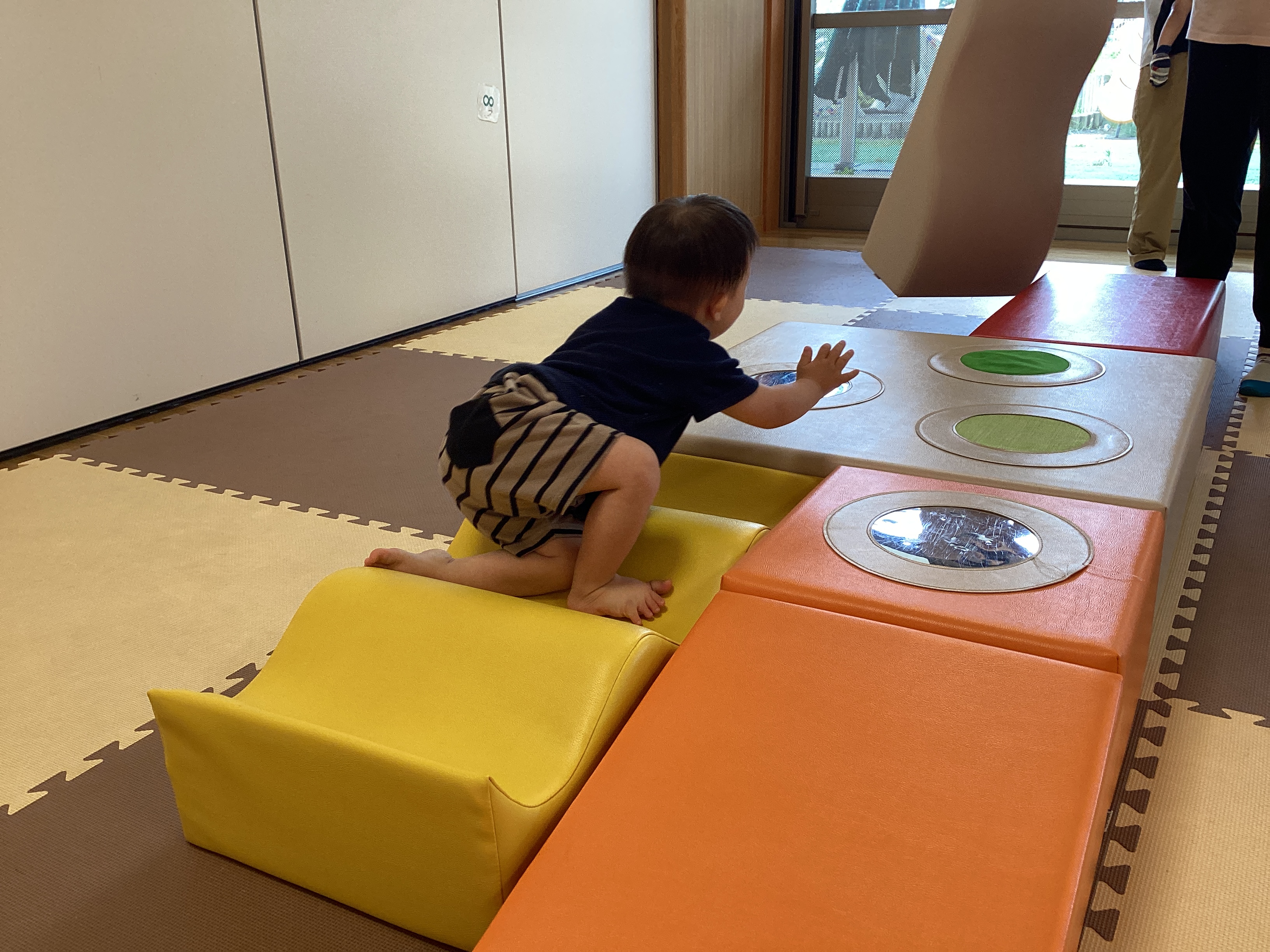 椅子や床に座ることが慣れてきたころ、バランスを取りながら座る遊びを取り入れています。