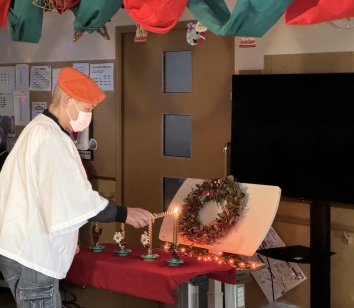 クリスマス祝会では、元寮長の三輪尚士さまより、聖隷の成り立ちとクリスマスとの関わりについてお話を伺いました。その後、アドベントキャンドルに火を灯し、利用者・職員合同でキリスト降誕劇の朗読を行い、クリスマスイブらしい特別な時間を過ごすことができました。
