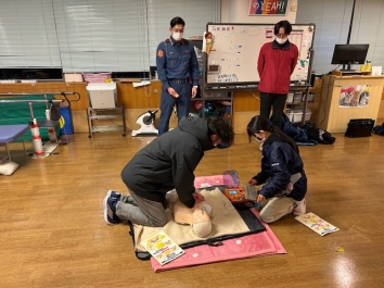 浜松市北消防より署員をお招きし、AEDの使用法・胸部圧迫など「救急法」を学びました。多くの援助者を集め、効果的な胸部圧迫をすることで助かる命をまもるということを目的に参加者は一生懸命