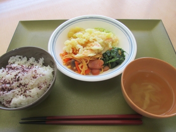献立は、ご飯、えび天、ほうれん草の胡麻和え、コンソメスープ、和風の味付けのナポリタンです。