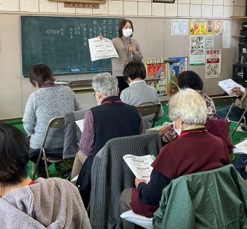 2月4日富塚自治会西和地区で開催されたシニアクラブ「喜楽会」に訪問し、地域包括支援センターとケアマネジャーの業務内容の紹介、高齢者虐待の啓発を行いました。また、和合愛光園デイサービス職員による認知症予防についての講話をしました。24名の方が参加されました。