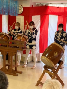 長寿のお祝いとともに、敬老会イベントとして三浦市の「海南神社祭囃子保存楽囃会」の皆様に祭囃子を披露していただきました。最初は迫力のある太鼓の演奏にご利用者はくぎ付けでしたが、楽囃会の皆さんに誘われ踊りの輪に参加する方もいて、楽しいひと時を過ごしていただきました。