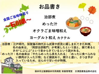 患者さんからは、「治部煮の鶏肉は軟らかく、わさびのアクセントもいい!」、職員からも「今日は特別な献立だなって一目でわかりました。」等の感想が聞かれました。今後も日本全国、その土地の美味しい!をお届けしていきます。