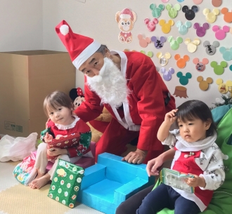 大きな袋を持ったサンタがベルを鳴らしながら登場すると、園児2名は「サンタさん!」ととても嬉しそうな笑顔。