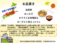 治部煮は、江戸時代、加賀藩の時代から武家や庶民に親しまれてきた料理で、名の由来は、「岡部治部衛門」が考案したという説と、鍋で煮るときの“じぶじぶ”という音からきているという説があるそうです。めった汁は、「やたらめったら具を入れる」「めったに食べられない豚肉が入った汁物」など諸説あり、さつま芋が入ってほんのり甘いのが特徴です。