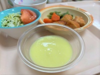 1月30日(金)の昼食は「冬の!たっぷりふくろいじもとごはん」と題して、地元食材を使ったお食事を提供しました。メニューは根菜の和風スパゲッティ、野菜の和風コンソメ煮、ブロッコリーと南瓜のサラダ、抹茶ゼリーあんこ添えです。食材は袋井産のかぶ、小松菜、はくさい、大根、ブロッコリーを使用しました。旬の野菜の食感を活かし、麺が伸びずに提供できるよう、試行錯誤しました。患者さんからは、「ご飯に飽きてきたから、たまにはこういうのも嬉しいね」、「お品書きは家族に見せるように取ってあるの」などのお声を頂きました。地のものを食べて活力を養って頂けるよう、今後も定期的に企画していきたいと思います。