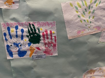 11月13日(木)より作品の展示を開始しました。今年は「親子の絆」をテーマにNICU・GCUに入院しているあかちゃんとご家族に手形アートを作成してもらい展示しています。ゾウやアヒル、ライオンなど親子で仲良く楽しそうな手形アートができました。