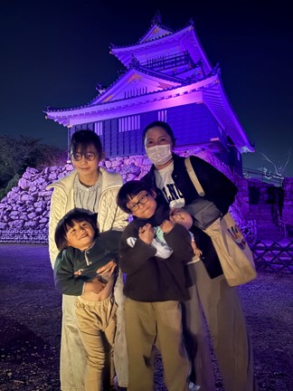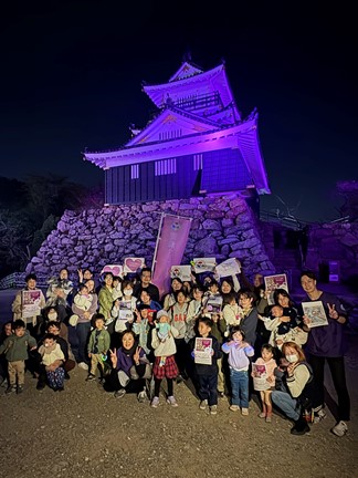 17日の夕方、浜松市内の小児周産期医療従事者の有志によって構成された実行委員会の主催で浜松城がシンボルカラーの紫色にライトアップされました。当院スタッフや地域の新生児医療に携わるスタッフ、看護学生、当院を卒業した早産児と、そのご家族へも呼びかけ、総勢50名ほどが浜松城前に集合しました。みんなで浜松城のライトアップを共有したり、集合写真や、当時の懐かしい話をしたりなど盛り上がりました。