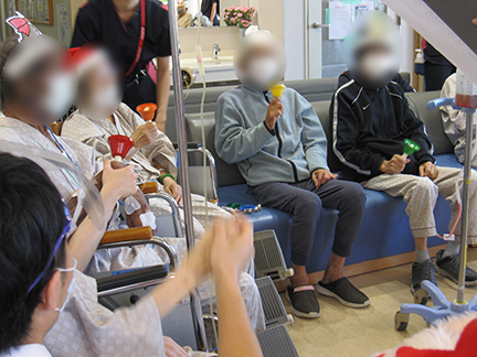 次はハンドベルの演奏会です。スタッフの指揮のもと、即興で患者さんたちによる演奏が行われ、両手に鈴とハンドベルを持って演奏する器用な方もいました。