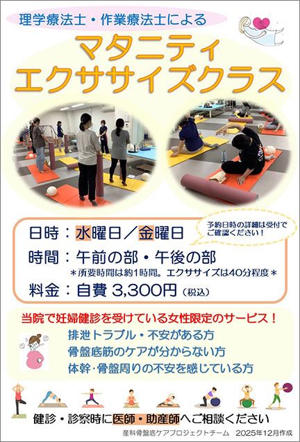妊娠期より骨盤底筋について正しい知識をもってご自身でもケアができるよう、理学療法士・作業療法による「集団マタニティエクササイズクラス」を開催しています。妊娠期の尿漏れや、出産後の骨盤底筋のトラブルは、女性にとって気になる内容です。