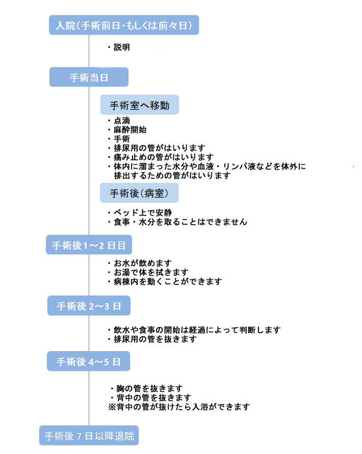 入院は手術前日(もしくは前々日)。通常は術後の痛みも少なく、翌日には歩行も可能です。