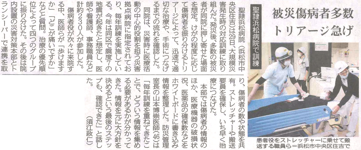 | 大地震発生 患者トリアージ 迅速に分類 情報共有密に医師ら訓練 聖隷浜松病院 | 2024年12月1日 | 中日新聞 |