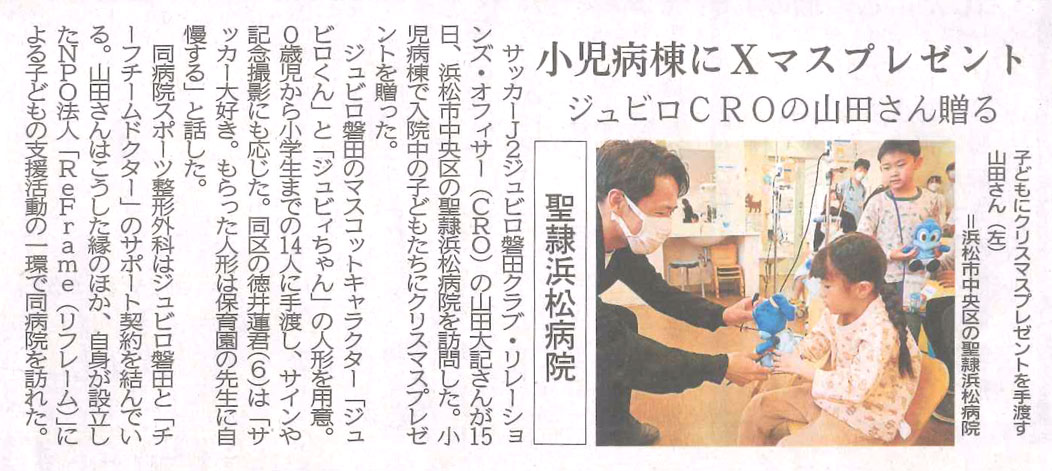 | 小児病棟にXマスプレゼント ジュビロCROの山田さん贈る 聖隷浜松病院 | 2025年12月19日 | 静岡新聞 |