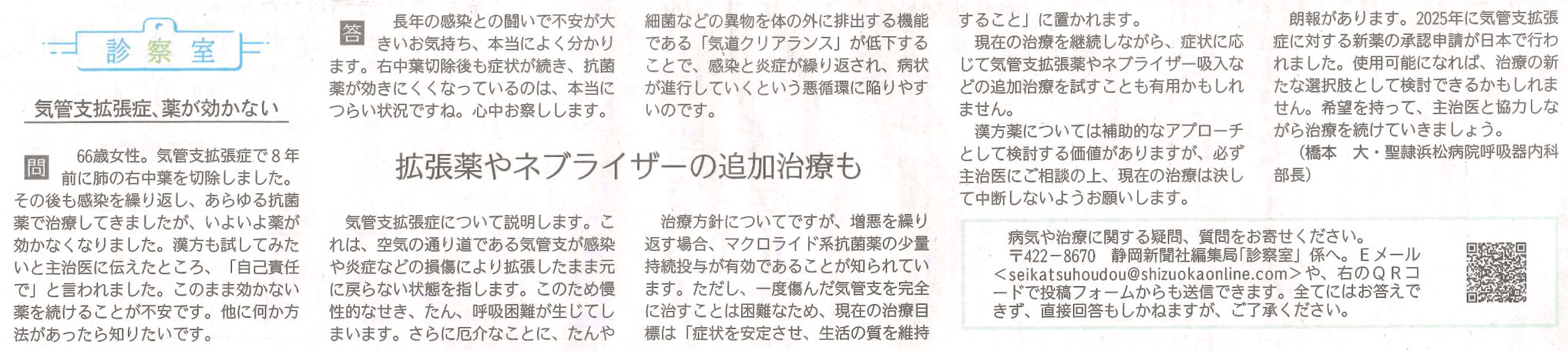 | 診察室「気管支拡張症、薬が効かない」 呼吸器内科部長 橋本 大 医師 | 2026年2月3日 | 静岡新聞 |