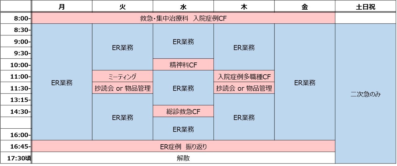 - 毎月、日勤(ERまたはICU)が10-13回程度、夜勤(ICU)が3-5回程度です。休日は平日休みを2-3日程度含む、10日前後です。