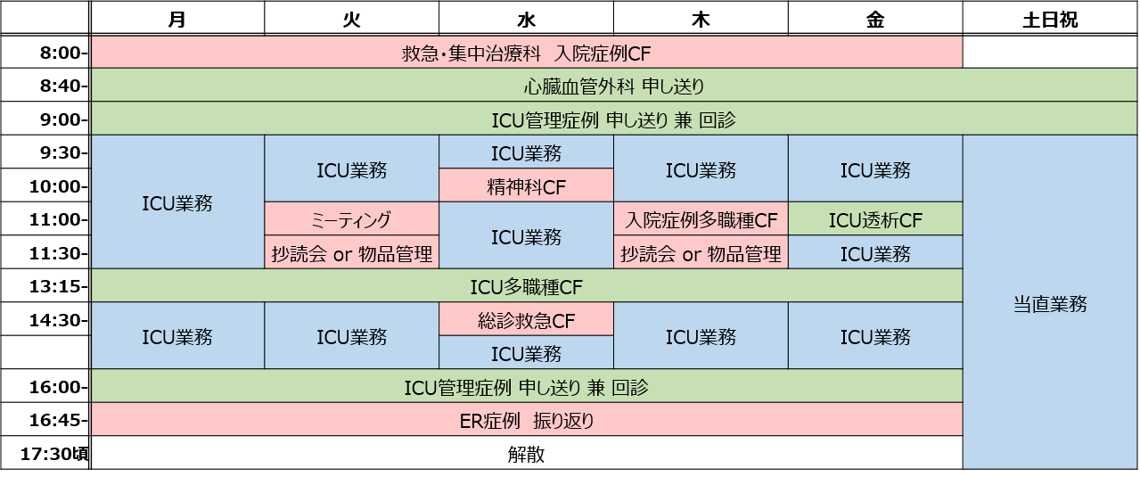 - ICU多職種CF:多職種(看護師、薬剤師、栄養士、理学療法士、臨床工学技士)とのカンファレンス。