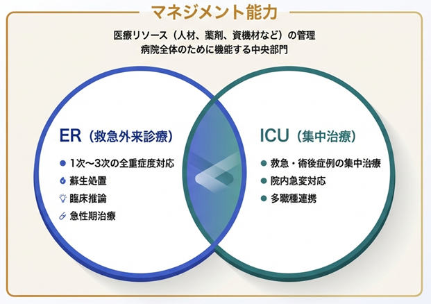 - ⟡ 救急医、集中治療医としての個人技能の習得だけでなく、医療リソース(人材、薬剤、資機材など)をマネジメントする能力も磨き、病院の中央部門として病院