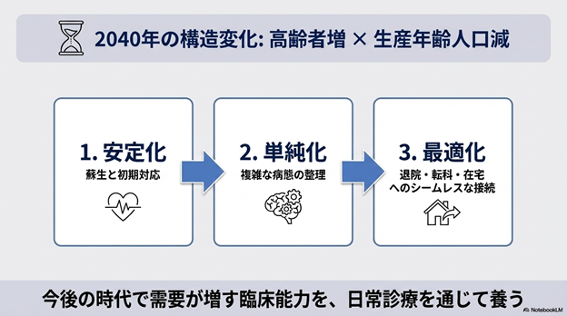 最強の specialty(専門分野)です。2040年に向けて変化する人口動態、変化する医療ニーズに対応できる臨床能力が備わります。