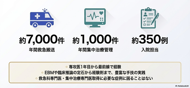 - 専門医取得(救急科専門医、集中治療専門医)に必要な症例や手技の経験に困ることはありません。
