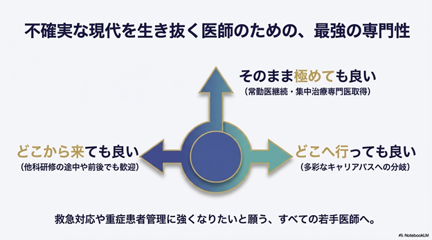 - ⟡ 救急医療と集中治療は「どこから来ても良い」「どこへ行っても良い」「そのまま極めても良い」という、不確実な現代を生き抜く医師にとって、ある意味では