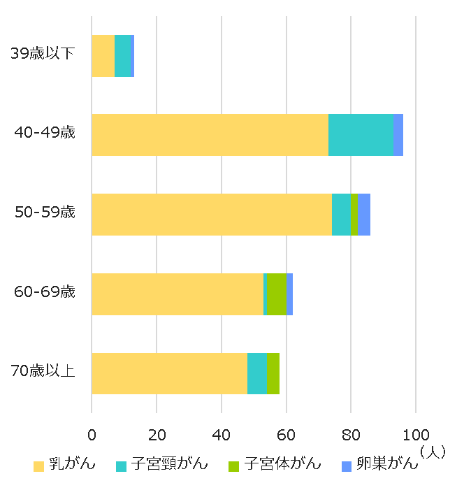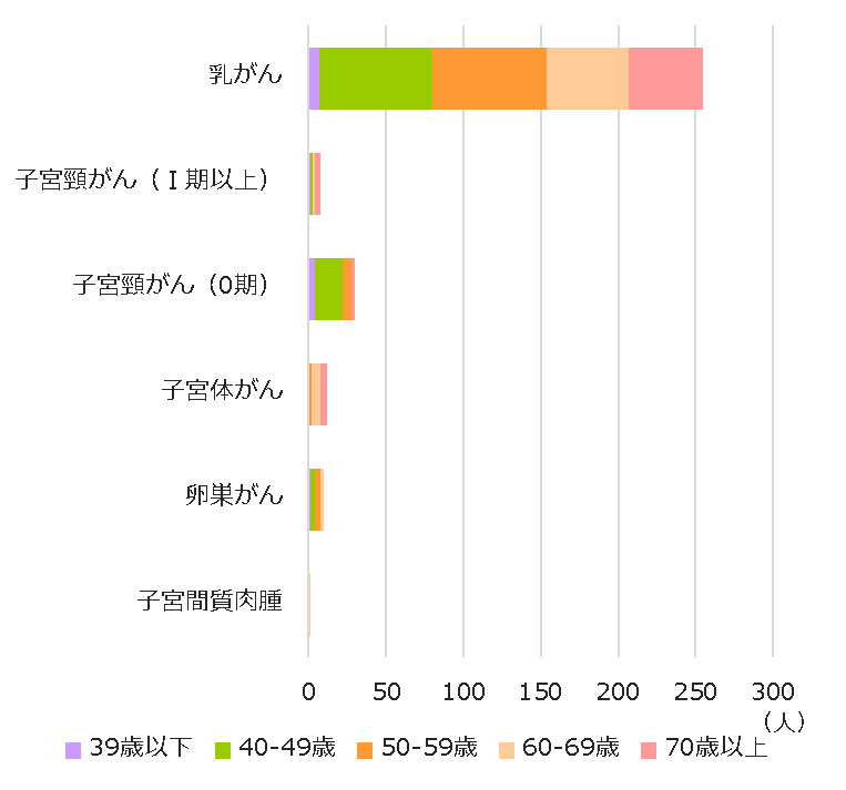 2023年度 婦人科検診 がん発見数 39歳以下 40-49歳 50-59歳 60-69歳 70歳以上 発見数 乳がん 7 73 74 53 48 255 子宮頸がん(I期以上) 1 2 0 1 4 8 子宮頸がん(0期) 4 18 6 0 2 30 子宮体がん 0 0 2 6 4 12 卵巣がん 1 3 4 2 0 10 子宮間質肉腫 0 0 0 1 0 1 合計 13 96 86 63 58 316 婦人科:2023年度がん発見数 婦人科:2023年度年齢別がん発見数