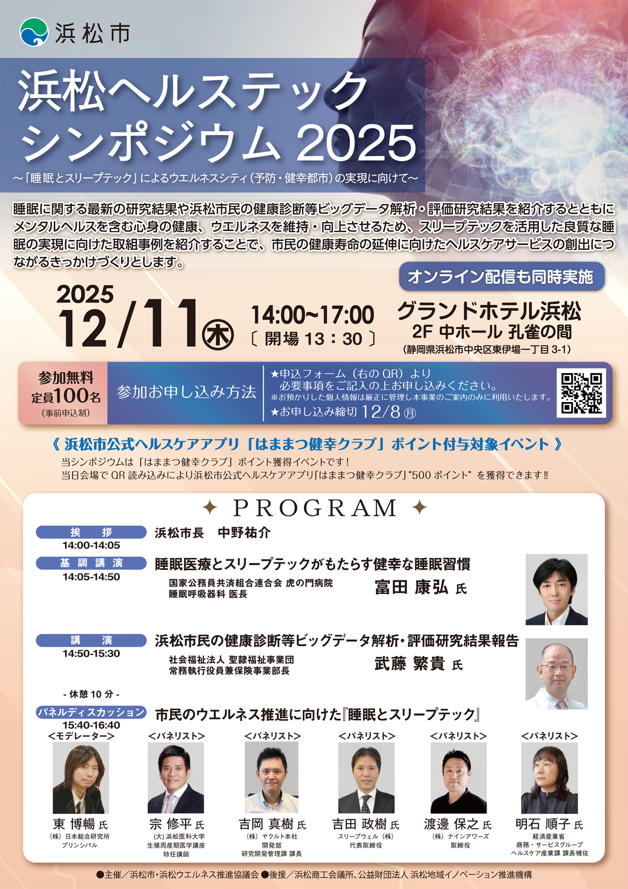 浜松市と浜松ウエルネス推進協議会が主催する「浜松ヘルステックシンポジウム2025」が12月11日(木)にグランドホテル浜松にて開催されます。