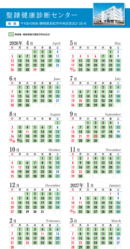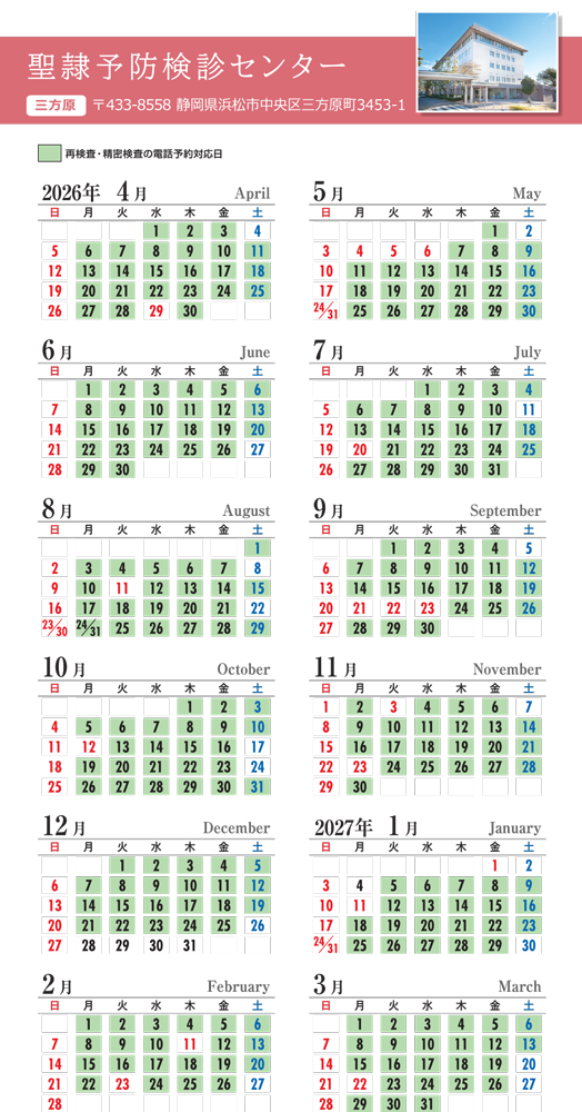 *土曜日は「再検査・精密検査の電話予約対応日」カレンダーをご参照ください
