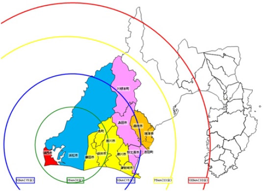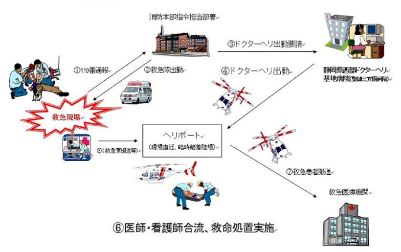 当静岡県西部ドクターヘリは、西は湖西市、東は焼津市、藤枝市、島田市、川根本町までを主に管轄しています。静岡市から東は順天堂大学静岡病院に基地を置く静岡県東部ドクターヘリが担当しています。
