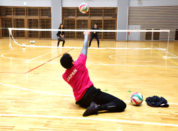 座ってプレーするバレーボール。でん部が床についたまま競技を行います。スピード感あふれるラリーやコンビネーションを駆使した戦略的な戦い方が魅力のスポーツです。