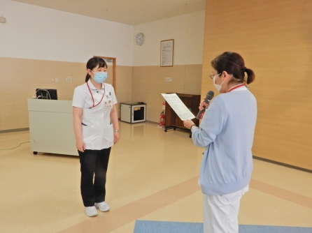 2021年度クリニカルラダー認定者に認定証の授与を看護課長会で行いました。代表でレベルⅤを認定されたM課長に、おめでとうございます。