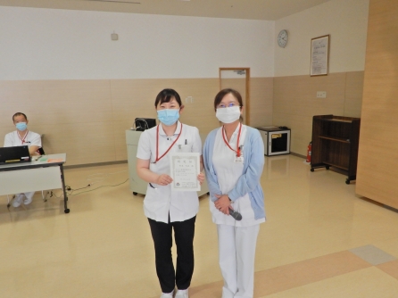 2021年度クリニカルラダー認定者に認定証の授与を看護課長会で行いました。代表でレベルⅤを認定されたM課長に、おめでとうございます。