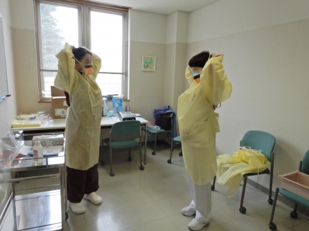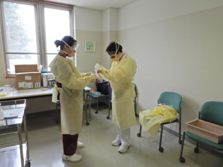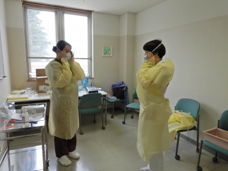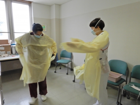 コロナ病棟の入院患者さんは0名になりました。しかしながら、次ぎに備え順次PPE着脱練習を進めています。Yさんは6月から看護相談室から病棟へ異動になりましたから備えているのでしょうね。