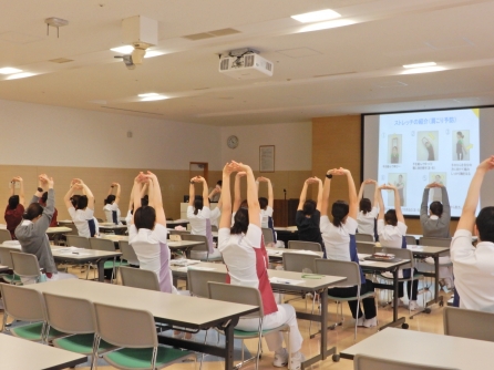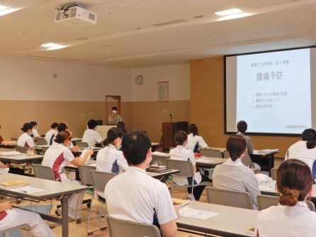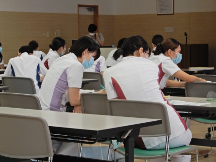 6/27 新人看護師対象の集合研修「食事援助と創傷管理に関する研修」2回目がありました。聖隷クリストファー大学基礎実習室もお借りしてポジショニングの演習も実施します。研修後は、聖隷健康保険組合による「腰痛予防」を1時間入れています。