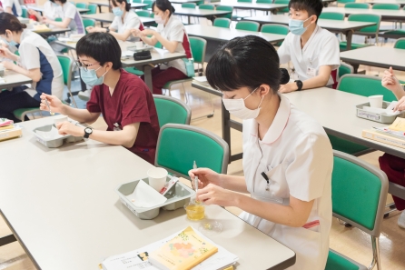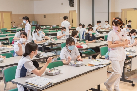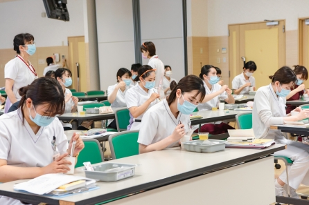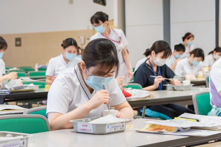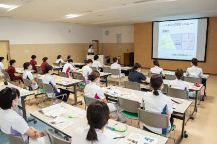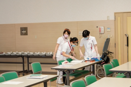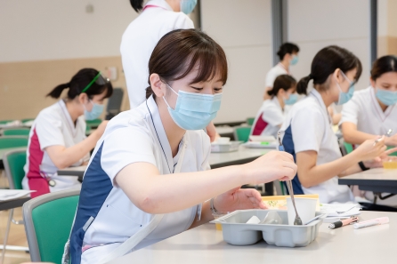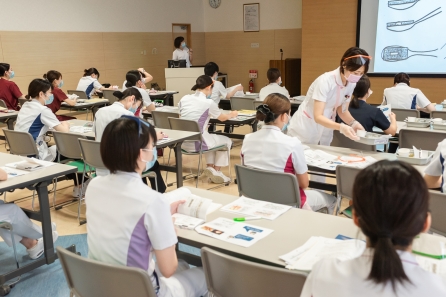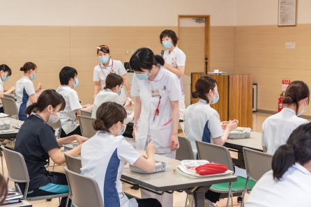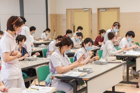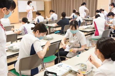 すこ~し前になってしまいますが、6月21・27日の2班に分かれて「食事援助と創傷管理」の研修がありました。講師に摂食嚥下障がい看護認定看護師のYさんと皮膚排泄ケア認定看護師のSさんを迎えての研修になります。対象はクリニカルラダーⅠをめざす看護職、この春入職した新人看護職の皆さんの研修になります。正しい知識と基本的な技術習得のため演習が多くなります。入職して3ヶ月、現場の緊張感から少し離れて同期とともに受ける研修、笑顔の多い研修となりました。