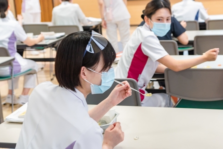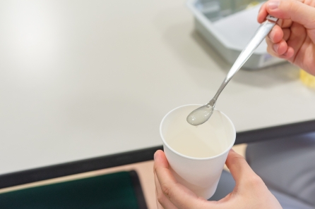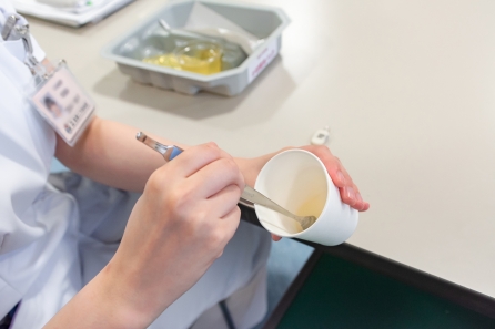お茶ゼリーのスライスの仕方、薬の与薬方法等を行います。