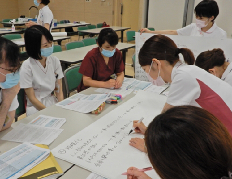 7月12日大ホールでは約20名の看護師が研修を受講していました。クリニカルラダーⅣ・Ⅴをめざす看護職を対象としている研修ですので中堅以上の看護師ばかりです。がん患者のスピリチュアルペインの構造の理解とアセスメント、計画立案と実践、コミュニケーションスキルなど演習が2/3の研修です。研修を実践に活かすことはもちろん、横のつながりを作る機会にもなればと思います。
