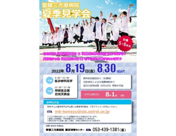 2022年度 夏季見学会について詳細をUPしました。 年に一度の特別な見学会です。 通常見学とはひと味違う見学会に参加してみませんか? 午前中の希望診療科は先着順です☆ 遠方からの参加希望の方には宿舎の利用も可能です。 過去の夏季見学会に参加したことのある当院の研修医達の声も是非参考にしてくだいね♪♪ 一緒に特別な一日を楽しみましょう!! 皆様からの沢山のお申込みをお待ちしております!! ※新型コロナ感染状況によっては開催を中止する場合がございます。