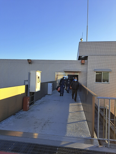 7:30屋上のヘリポートへ 飛び立つ準備をしています。