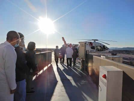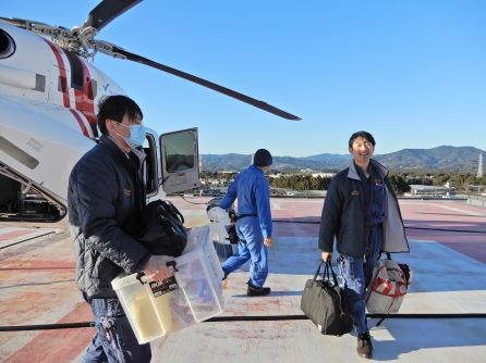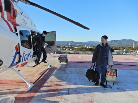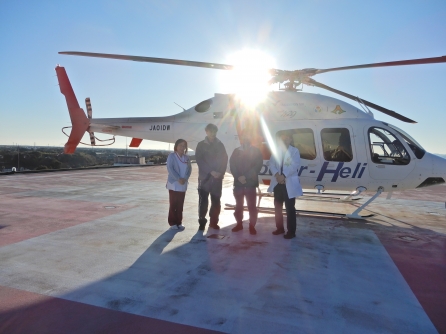 14:47地域医療連携室よりヘリが15:30頃戻りそうだと連絡が入りました。続いて14:55救急部長から30分後に戻ると連絡が入りました。16:52の日没前と思っていましたのでギリギリでなくて良かったです。ヘリから降りてきた4名のにこやかに笑顔に安堵しました。出発時より一回り顔が小さくなっていました、大きなミッションを果たしたことが伺えます。おかえりなさい。