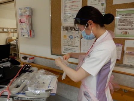 同じくC4病棟のKさん。「これからシャルドンフラッシュに行きます!」と。もう透析カテーテルの管理は複数回実施していて技術習得していました。素晴らしい!