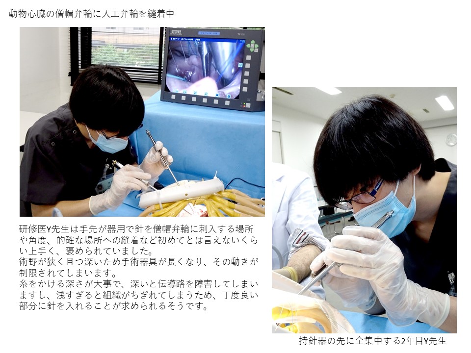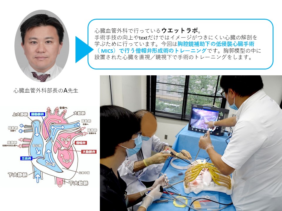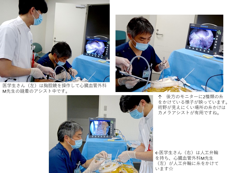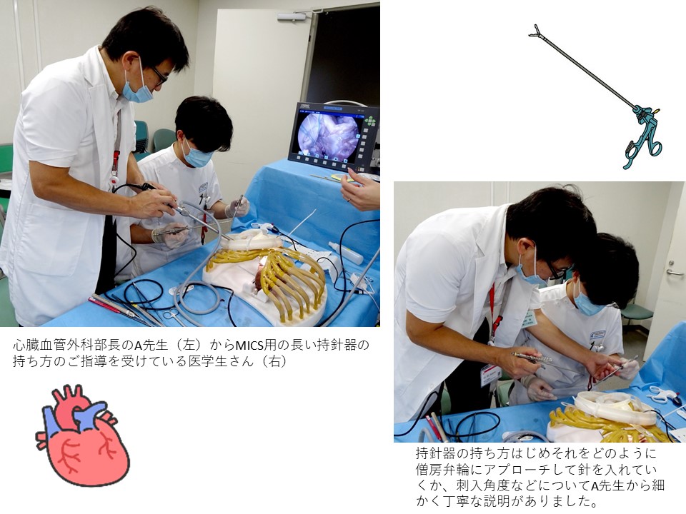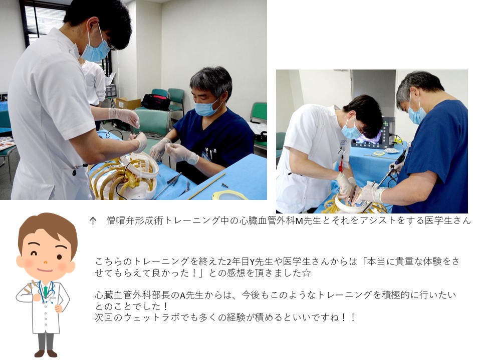 豚の心臓を用いる手術シミュレーションで、心臓血管外科の先生方はじめ初期研修医と医学生さんがMICS(Minimally Invasive Cardiac Surgery:肋骨と肋骨のの間を小さく切開して手術する方法) MVP(右小開胸による僧帽弁形成術)の模擬トレーニングを実施しましたので、その様子をご報告します!!