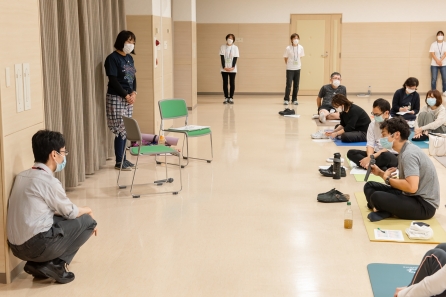 当日は医師、看護師、医療技術職、事務職の33名が参加し、呼吸法やヨーガセラピーを体験しました。