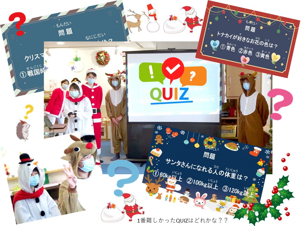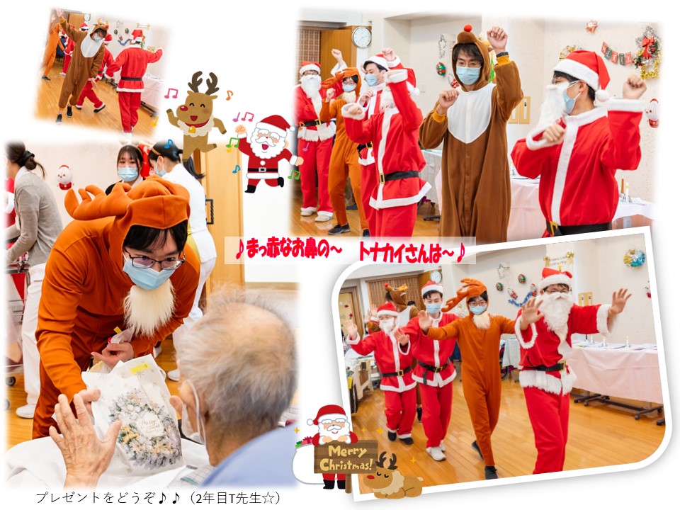 サンタさんには1年目M先生、助っ人としてトナカイに扮した1年目F先生の4名でクリスマス会を盛り上げることとなりました!